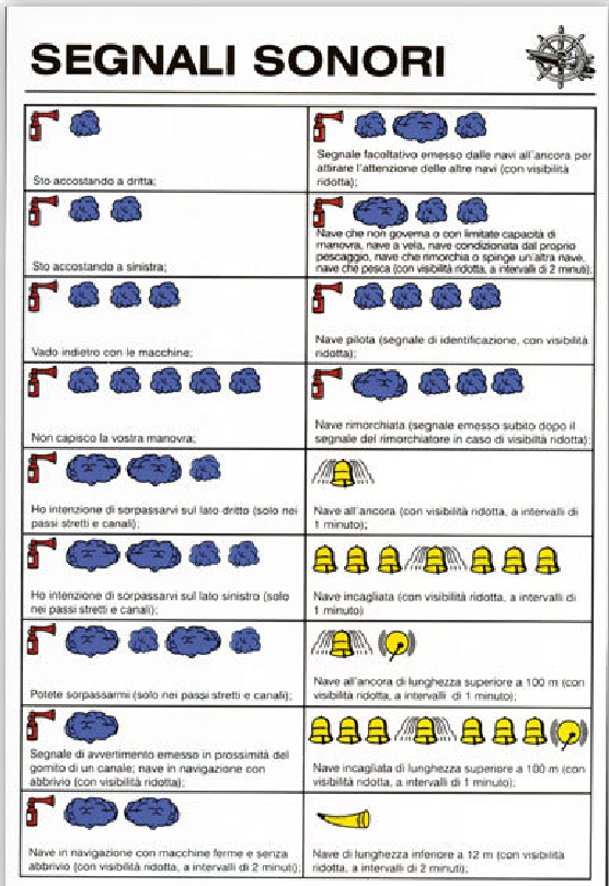 I segnali sonori marittimi che si suddividono in suoni “brevi” ( . ) di circa un secondo e suoni “lunghi” ( – ) della durata da quattro a sei secondi. A seguito un breve elenco dei segnali di manovra e di avvertimento: